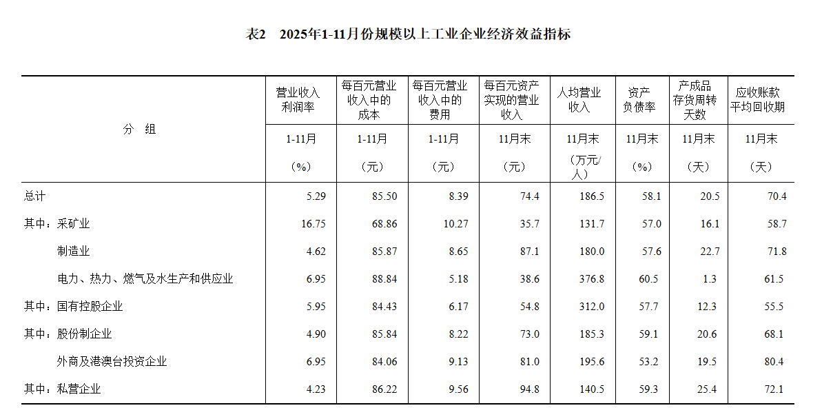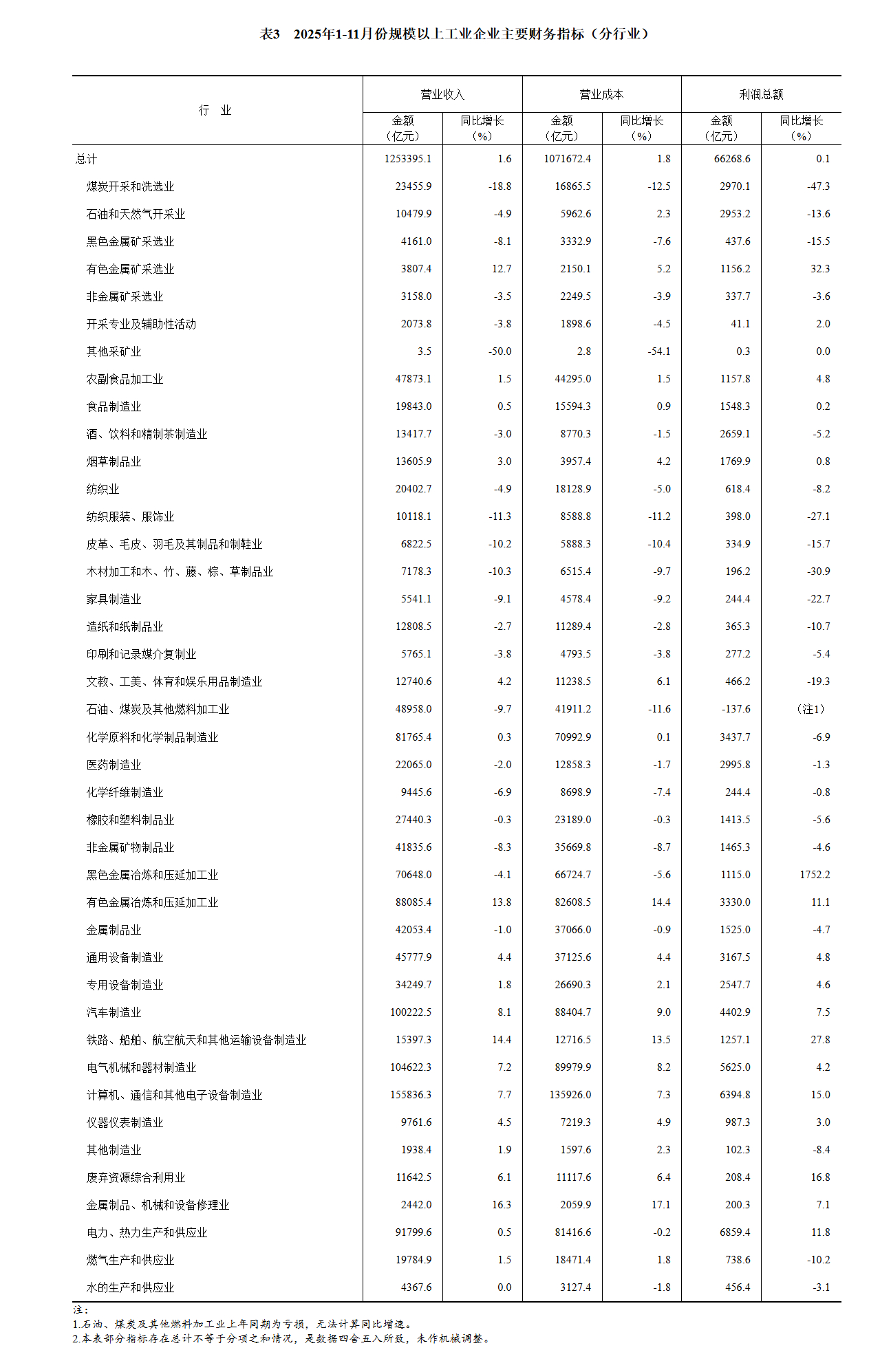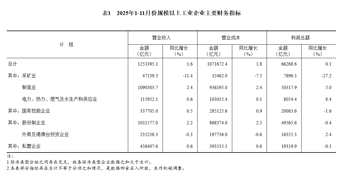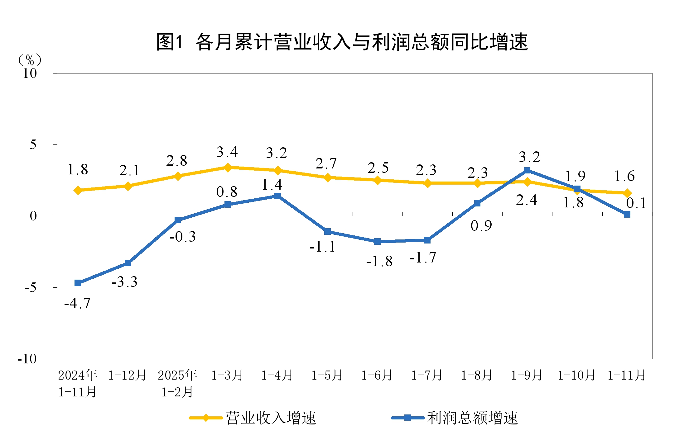2025年1—11月份全国规模以上工业企业利润增长0.1%